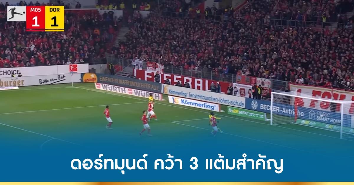 ฟุตบอลบุนเดสลีกา เยอรมนี เมื่อคืนที่ผ่านมา “เสือเหลือง” โบรุสเซีย ดอร์ทมุนด์ บุกไปเยือน ไมนซ์ ที่สนาม มิวอา อารีน่า เปิดฉากครึ่งแรกได้ 2 นาที เจ้าบ้าน ได้ประตูขึ้นนำเร็วจากจังหวะเตะมุม และเป็น อี แจ-ซอง โขกเข้าไปให้ทีมขึ้นนำ 1-0 แต่ถัดมา 2 นาที ดอร์ทมุนด์ ตามตีเสมอจากจังหวะยิงนอกกรอบของ จูเลียน ไรเออร์สัน บอลแฉลบกองหลังไมนซ์เปลี่ยนทางเข้าประตูไป จบครึ่งแรกเสมอ 1-1
