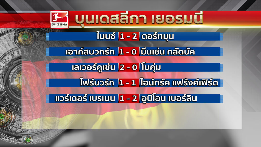 เยอรมนี 26 ม.ค.-โบรุสเซีย ดอร์ทมุนด์ คว้า 3 แต้มสำคัญ หลังบุกไปเฉือนชนะ ไมนซ์ 2-1 ช่วงท้ายเกม ขณะที่ ไฟว์บวร์ก เปิดบ้านเสมอ แฟร้งค์เฟิร์ต 1-1