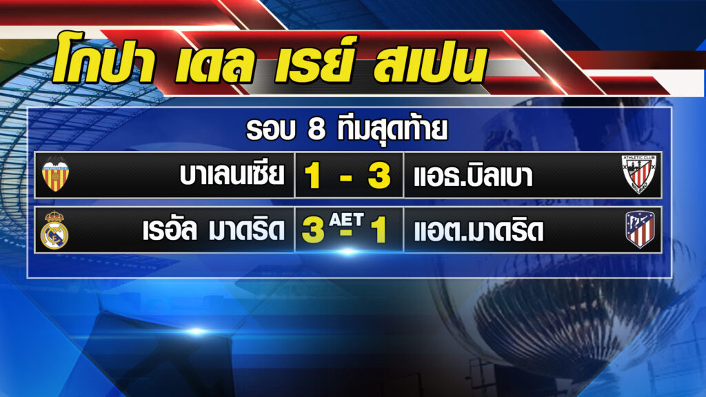 ส่วนผลฟุตบอลโกปา เดเรย์ สเปน รอบ 8 ทีมสุดท้าย บานเลนเซีย พ่ายให้กับ แอธเลติก บิลเบา 1-3 และ เรอัล มาดริด เอาชนะ แอตเลติโก มาดริด ในช่วงต่อเวลาพิเศษ 3-1 หลังเสมอกันในเวลา 1-1 ซึ่งเกมนี้ สเตฟาน ซาวิช กองหลัง แอตฯ มาดริด โดน 2 ใบเหลือง เป็นใบแดงไล่ออกจากสนาม.-สำนักข่าวไทย