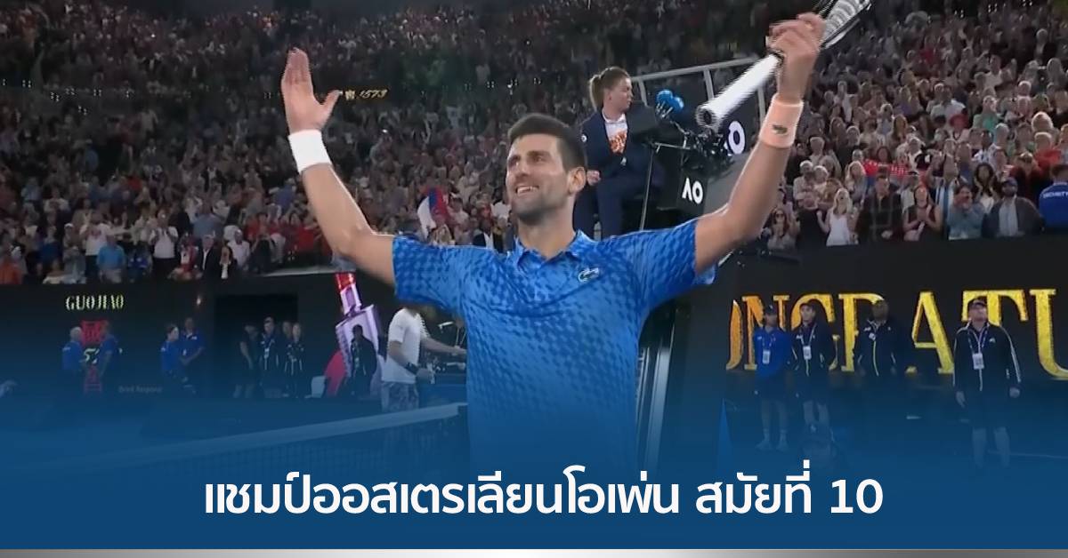 เทนนิสออสเตรเลียน โอเพ่น รายการแกรนด์สแลมแรกของปี 2023 ที่เมลเบิร์น ปาร์ค ประเทศออสเตรเลีย ชายเดี่ยว รอบชิงชนะเลิศ โนวัค ยอโควิช มือ 5 ของโลกและอดีตแชมป์ 9 สมัยวัย 35 ปีจากเซอร์เบีย พบ สเตฟานอส ซิตซิปาส มือ 4 ของโลกจากกรีซ เกมนี้ โนเล่ ใช้เวลา 2 ชั่วโมง 56 นาที หวดเอาชนะไปได้ 3 เซตรวด 6-3 , 7-6 ไทเบรก 7-4 และ 7-6 ไทเบรก 7-5 คว้าแชมป์ออสเตรเลียน โอเพ่น สมัยที่ 10 และเป็นแชมป์แกรนด์สแลมที่ 22 สูงสุดเทียบเท่า ราฟาเอล นาดาล จากสเปน รวมถึงเป็นแชมป์เอทีพีทัวร์ที่ 93 ของยอโควิช เป็นสถิติคว้าแชมป์อาชีพสูงสุดตลอดกาลอันดับ 3 แซงนาดาล ที่คว้าแชมป์ไป 92 รายการ พร้อมขยับขึ้นยึดตำแหน่งมือ 1 ของโลกได้อีกครั้ง