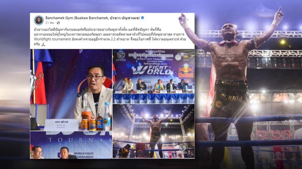 อสมท 3 ก.พ. – เพจ บัญชาเมฆ ยิม โพสต์ทวงเงินผู้ใหญ่กัมพูชา ที่ไปขึ้นชกในรายการ Worldfight tournament วอนจ่ายค่าตัว บัวขาว บัญชาเมฆ 2.2 ล้านบาท