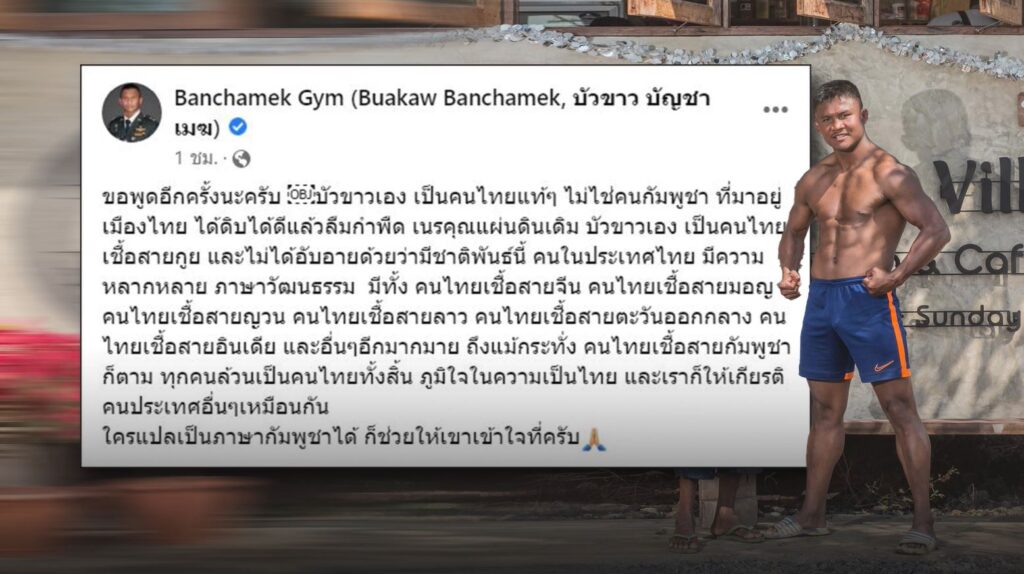 นอกจากนั้น เฟซบุ๊ก Banchamek Gym (Buakaw Banchamek, บัวขาว บัญชาเมฆ ยังโพสต์อีกด้วยว่า ขอพูดอีกครั้งนะครับ บัวขาวเอง เป็นคนไทยแท้ๆ ไม่ไช่คนกัมพูชา ที่มาอยู่เมืองไทย ได้ดิบได้ดีแล้วลืมกำพืด เนรคุณแผ่นดินเดิม บัวขาวเอง เป็นคนไทยเชื้อสายกูย และไม่ได้อับอายด้วยว่ามีชาติพันธุ์นี้ คนในประเทศไทย มีความหลากหลาย ภาษาวัฒนธรรม มีทั้งคนไทยเชื้อสายจีน คนไทยเชื้อสายมอญ คนไทยเชื้อสายญวน คนไทยเชื้อสายลาว คนไทยเชื้อสายตะวันออกกลาง คนไทยเชื้อสายอินเดีย และอื่นๆ อีกมากมาย ถึงแม้กระทั่ง คนไทยเชื้อสายกัมพูชาก็ตาม ทุกคนล้วนเป็นคนไทยทั้งสิ้น ภูมิใจในความเป็นไทย และเราก็ให้เกียรติ คนประเทศอื่นๆ เหมือนกัน .-สำนักข่าวไทย