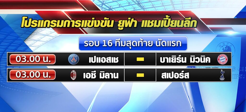 ส่วนโปรแกรม รอบ 16 ทีมสุดท้าย นัดแรก อีก 1 คู่ เอซี มิลาน พบ ท็อตแนม ฮอตสเปอร์ส เวลา 03.00 น. – สำนักข่าวไทย