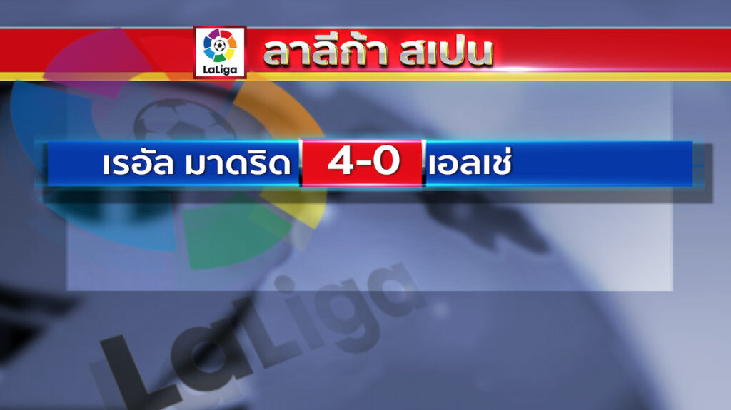 ขณะที่ผลฟุตบอล ลาลีกา สเปน เรอัล มาดริด ถล่มชนะ เอลเช 4-0 มีเพิ่มเป็น 48 คะแนน จาก 21 นัด ตามหลังจ่าฝูง บาร์เซโลน่า 8 คะแนน .-สำนักข่าวไทย