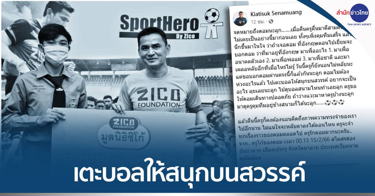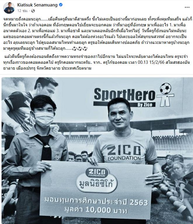 ซิโก้ โพสต์เฟซบุ๊กส่วนตัวอีกครั้งหลังเที่ยงคืนที่ผ่านมา จากสโมสรฮองอันยาลาย เมืองเปรกรู จังหวัดยาลาย ประเทศเวียตนาม โดยเขียนว่า จดหมายถึงดอมนะลูก…….เมื่อคืนครูตื่นมาตีสามครึ่ง ซึ่งไม่เคยเป็นอย่างนี้มาก่อนเลย ทั้งๆ เพิ่งคุมทีมเสร็จ แล้วก็นึกขึ้นมาในใจ ว่าถ้าเจอดอมที่อังกฤษตอนไปเยี่ยมจะบอกดอมว่าที่มาอยู่ที่อังกฤษ มาเพื่ออะไร 1. มาเพื่ออนาคตตัวเอง 2. มาเพื่อพ่อแม่ 3. มาเพื่อชาติ และมาเผลอหลับอีกทีเมื่อไหร่ไม่รู้ วันนี้ครูก็ยังนอนไม่หลับนะ แต่ขอบอกดอมผ่านตรงนี้ก็แล้วกันนะลูก ดอมไม่ต้องห่วงอะไรแล้ว ไปเตะบอลให้สนุกบนสวรรค์ อยากจะเป็นอะไร ลุยเลยนะลูก ไปดูบอลสนามไหนทำเลยลูก ครูขอให้ดอมเดินทางปลอดภัย ถ้าว่างแวะมาหาครูบ้างนะลูก มาดูครูคุมทีมอยู่ข้างสนามก็ได้นะลูก…