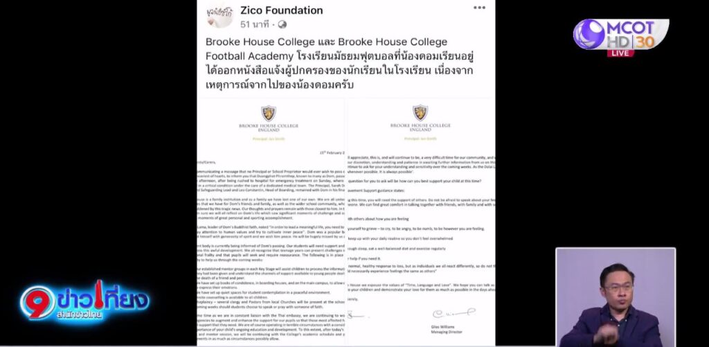 ส่วนที่ Brooke House College และ Brooke House College Football Academy โรงเรียนมัธยมฟุตบอลที่น้องดอมเรียนอยู่ ได้ออกหนังสือแจ้งผู้ปกครองนักเรียนในโรงเรียน เนื่องจากเหตุการณ์จากไปของน้องดอม. – สำนักข่าวไทย