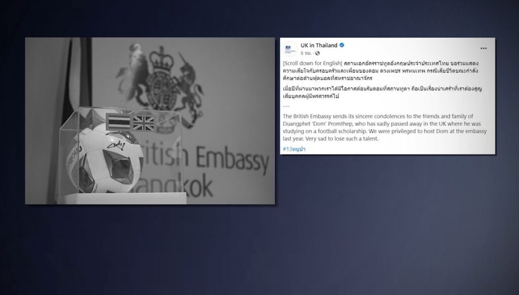 ส่วนเพจสถานเอกอัครราชทูตอังกฤษประจำประเทศไทย ได้โพสต์ข้อความ พร้อมรูปภาพ ขอร่วมแสดงความเสียใจกับครอบครัวและเพื่อนของดอม-ดวงเพชร พรหมเทพ กรณีเสียชีวิตขณะกำลังศึกษาต่อด้านฟุตบอลที่สหราชอาณาจักร เมื่อปีที่ผ่านมาพวกเราได้มีโอกาสต้อนรับดอมที่สถานทูตฯ ถือเป็นเรื่องน่าเศร้าที่เราต้องสูญเสียบุคคลผู้มีพรสวรรค์ไป