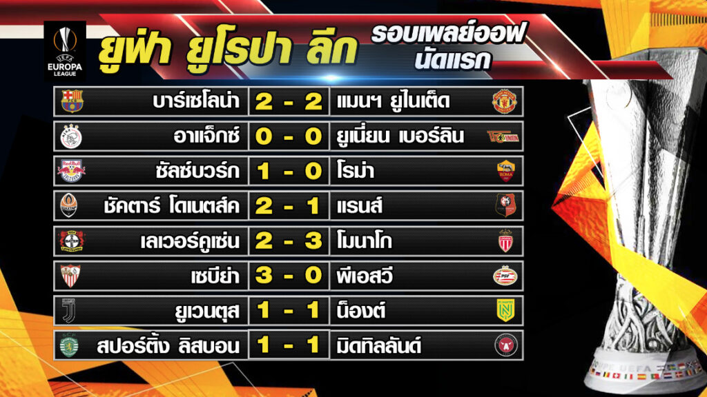 ผลฟุตบอลถ้วยยูฟ่า ยูโรป้าลีก รอบเพลย์ออฟ หาทีมผ่านเข้ารอบ 16 ทีมสุดท้าย นัดแรก “เจ้าบุญทุ่ม” บาร์เซโลนา ที่หล่นมาจากถ้วยแชมเปี้ยนส์ลีก เปิดสนาม คัมป์นู เสมอกับ “ปีศาจแดง” แมนเชส เตอร์ยูไนเต็ด ทีมอันดับ 2 ของยูโรป้าลีกกลุ่มอี 2-2 โดย มาร์กอส อลอนโซ โหม่งให้เจ้าบ้านขึ้นนำในนาทีที่ 50 แต่นาทีที่ 52 มาร์คัส แรชฟอร์ด ยิงตีเสมอเป็น 1-1 จากนั้นนาทีที่ 59 แมนฯ ยูไนเต็ด พลิกขึ้นนำจากการสกัดบอลพลาดของ ฌูลส์ กุนเด กองหลังเจ้าถิ่น แต่นาทีที่ 76 บาร์ซา ตีเสมอจากลูกยิงไกลของ ราฟินญา นัดที่ 2 จะไปเตะที่สนามโอลด์แทรฟฟอร์ด คืนวันที่ 24 กุมภาพันธ์