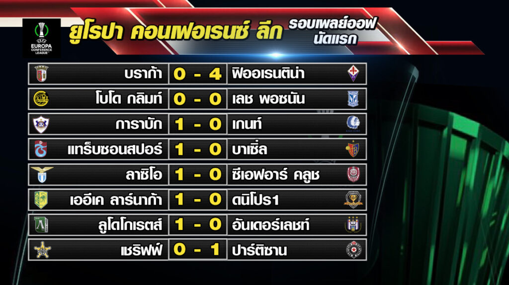 ส่วน ยูโรปา คอนเฟอเรนซ์ ลีก รอบเพลย์ออฟ นัดแรก คู่ที่น่าสนใจ บรากา 0-4 ฟิออเรนตินา แทร็บซอนสปอร์ 1-0 บาเซิล ลาซิโอ 1-0 ซีเอฟอาร์ คลูช ลูโดโกเรตส์ 1-0 อันเดอร์เลชท์ และเชริฟฟ์ 0-1 ปาร์ติซาน .-สำนักข่าวไทย