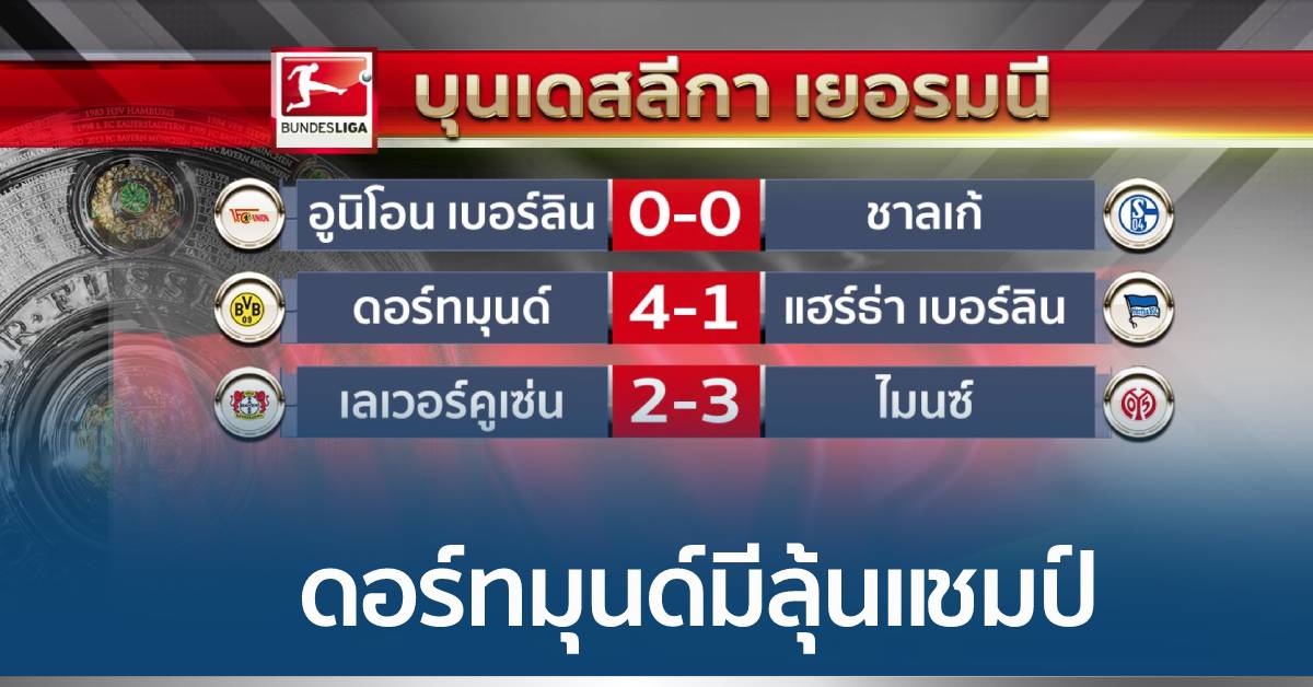 ฟุตบอลบุนเดสลีกา เยอรมนี “เสือเหลือง” โบรุสเซีย ดอร์ทมุนด์ เปิดสนามซิกนาล อิดูนา พาร์ค ถล่ม แฮร์ธา เบอร์ลิน 4-1 ดอร์ทมุนด์ ได้ประตูขึ้นนำ 1-0 ในนาทีที่ 27 จากลูกไขว้ของคาริม อเดเยมี ต่อมาอีกแค่ 4 นาที เจ้าบ้านก็มาได้ประตูทิ้งห่าง 2-0 จาก ดอนเยลล์ มาเลน กองหน้าชาวดัตซ์ แปเข้าไป โดยเป็นประตูแรกของเจ้าตัวในฤดูกาลนี้อีกด้วย