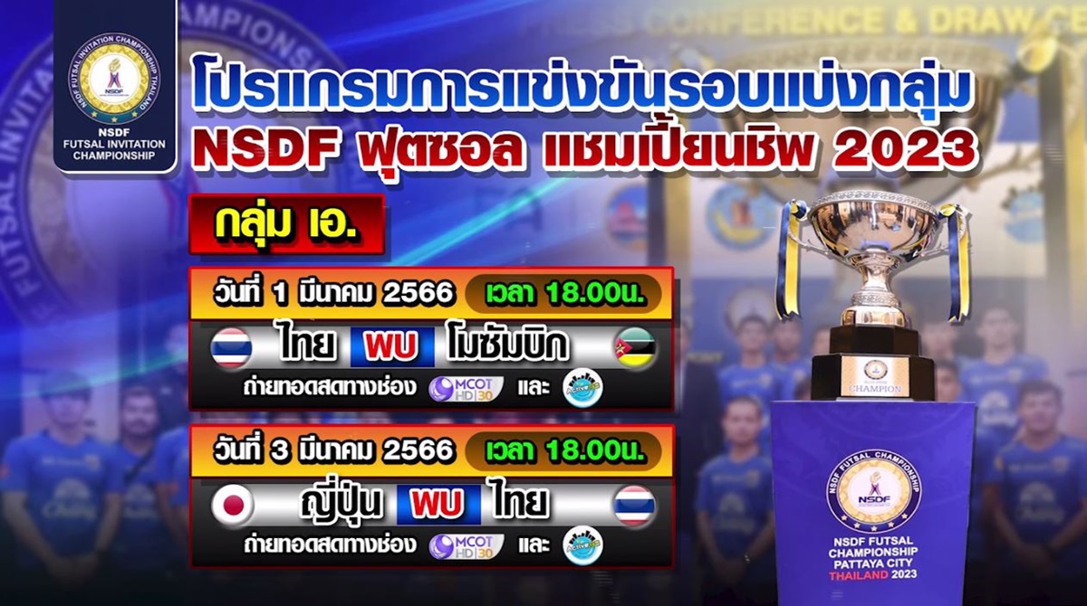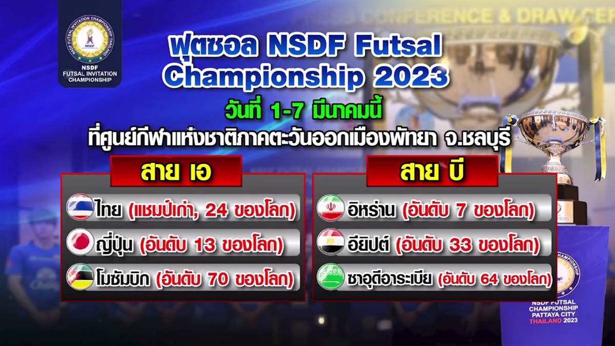 ศึกฟุตซอล NSDF Futsal Championship 2023 เตรียมเปิดฉากดวลแข้ง ระหว่างวันที่ 1-7 มีนาคมนี้ ที่ศูนย์กีฬาแห่งชาติภาคตะวันออก เมืองพัทยา จ.ชลบุรี โดยทีมฟุตซอลไทย ในฐานะแชมป์เก่า และอันดับ 24 ของโลก อยู่ในสายเอ ร่วมกับ ญี่ปุ่น อันดับ 13 ของโลก ดีกรีแชมป์เอเชียทีมล่าสุด และ โมซัมบิก อันดับ 70 ของโลก ส่วนสายบี อิหร่าน อันดับ 7 ของโลก, อียิปต์ อันดับ 33 ของโลก และ ซาอุดีอาระเบีย อันดับ 64 ของโลก