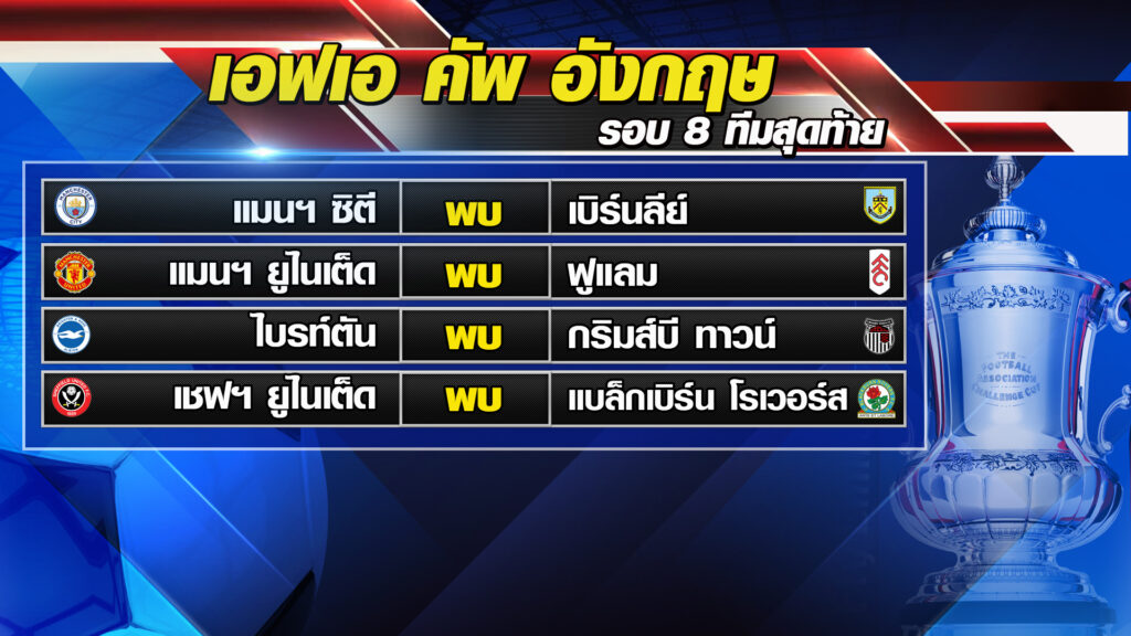 ฟุตบอลเอฟเอ คัพ อังกฤษ รอบ 16 ทีมสุดท้าย เมื่อคืนที่ผ่านมา “ปีศาจแดง” แมนฯ ยูไนเต็ด เปิดสนามโอลด์แทรฟฟอร์ด พบ “ขุนค้อน” เวสต์แฮม ยูไนเต็ด ครึ่งแรกเสมอกันอยู่ 0-0 ครึ่งหลังนาทีที่ 54 เอเมอร์ซอน เปิดบอลให้ ซาอิด เบนราห์มา ยิงเข้าเสาไกลให้เวสต์แฮม นำก่อน 1-0 นาทีที่ 77 บรูโน แฟร์นันด์ส เปิดเตะมุม นาเยฟ อาเกิร์ด กองหลังเจ้าถิ่น โหม่งพลาดเข้าประตูตัวเอง ช่วยให้แมนฯ ยูไนเต็ด ตามตีเสมอเป็น 1-1 ท้ายเกมนาทีที่ 90 แมนฯ ยูไนเต็ด ได้ประตูขึ้นนำ 2-1 จากการยิงสุดสวยของ อเลฮานโดร การ์นาโช ช่วงทดเวลาการแข่งขันนาทีที่ 90+5 เฟร็ด มายิงประตูปิดท้ายให้ แมนฯ ยูไนเต็ด แชนะ เวสต์แฮม 3-1 ผ่านเข้ารอบ 8 ทีมสุดท้ายได้สำเร็จ