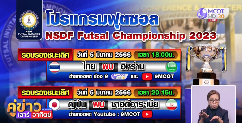 โปรแกรมฟุตซอล NSDF Futsal Championship 2023 วันที่ 5 มี.ค. 2566 รอบชิงอันดับ 5 เวลา 13.00 น. โมซัมบิก พบ อียิปต์ (ถ่ายทอดสดช่อง9 MCOT HD และ Youtube : 9MCOT ) รอบรองชนะเลิศ เวลา 18.00 น. ไทย พบ อิหร่าน (ถ่ายทอดสดช่อง9 MCOT HD และ Youtube : 9MCOT ) และเวลา 20.15 น. ญี่ปุ่น พบ ซาอุดีอาระเบีย (ถ่ายทอดสด Youtube : 9MCOT).-สำนักข่าวไทย