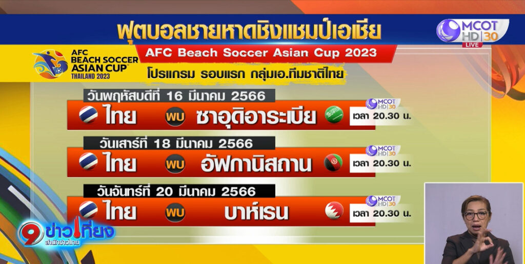 พัทยา 9 มี.ค.-“โค้ชเอก” กุนซือเท้าเปล่าทีมชาติไทย มอง บาห์เรน งานหนักสุดในกลุ่ม ศึกฟุตบอลชายหาดชิงแชมป์เอเชีย กลางเดือนมีนาคมนี้ ช่อง 9 กด 30 ถ่ายทอดสด