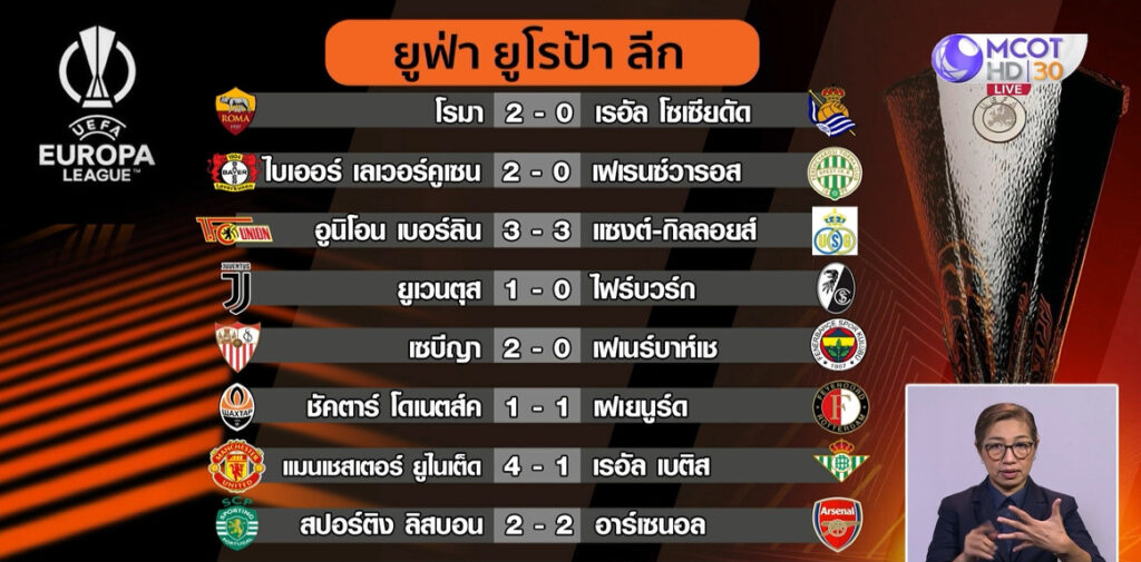 ส่วนผลคู่อื่น โรมา ชนะ เรอัล โซเซียดัด 2-0, ไบเออร์ เลเวอร์คูเซน ชนะ เฟเรนซ์วารอส 2-0, อูนิโอน เบอร์ลิน เสมอ แซงต์-กิลลอยส์ 3-3, ยูเวนตุส ชนะ ไฟร์บวร์ก 1-0, เซบีญา ชนะ เฟเนร์บาห์เช 2-0, ชัคตาร์ โดเนตส์ค เสมอ เฟเยนูร์ด 1-1.-สำนักข่าวไทย