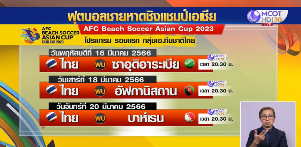 พัทยา 10 มี.ค.-ทีมฟุตบอลชายหาดไทย ตั้ง “วัชระ เลไพจิตร” เป็นกัปตันทีมลุยฟุตบอลชายหาดชิงแชมป์เอเชีย กลางเดือนมีนาคมนี้ ช่อง 9 กด 30 ยิงสดให้ชม ส่วนบอลหญิงยู 20 ไทย พร้อมดวลทาจิกิสถาน ค่ำวันนี้