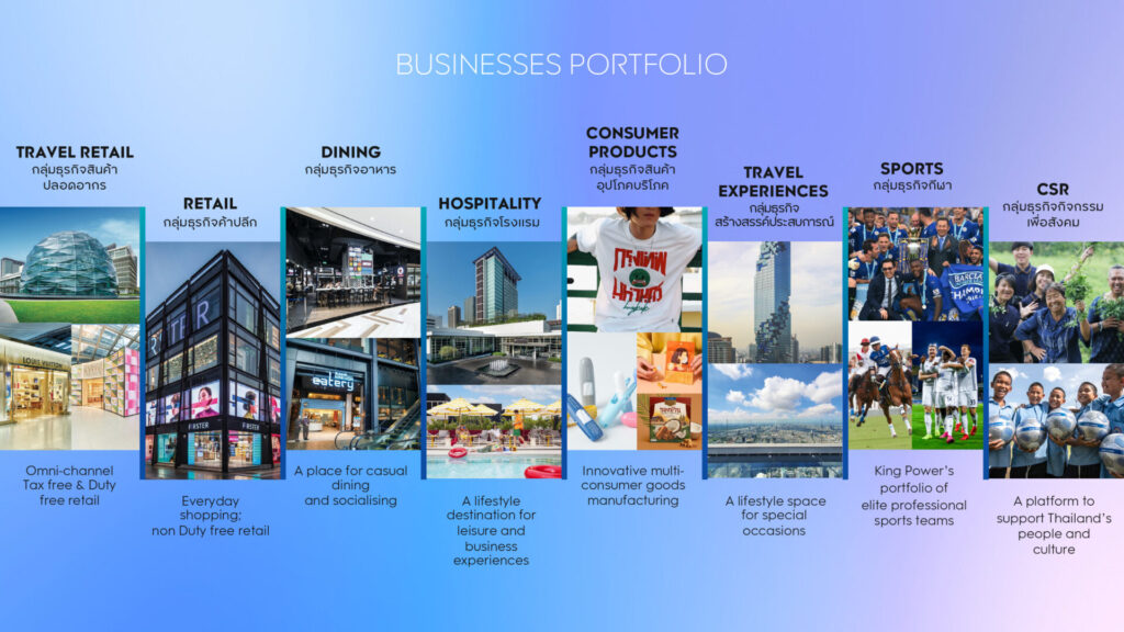 นายอัยยวัฒน์ เปิดเผยต่ออีกว่า คิง เพาเวอร์ พร้อมที่จะผนึกกำลังพันธมิตรทุกภาคส่วน เพื่อร่วมขับเคลื่อนเศรษฐกิจ และสังคมสู่ความยั่งยืนครบทุกมิติ ให้เป็นมากกว่ากลุ่มสินค้าปลอดภาษี พร้อมปรับโครงสร้างองค์กรให้เป็น Multi-Business จากเดิมที่มี 4 แกนหลัก ให้เป็น 8 แกนหลัก ประกอบด้วย กลุ่มธุรกิจสินค้าปลอดอากร, กลุ่มธุรกิจค้าปลีก, กลุ่มธุรกิจอาหาร, กลุ่มธุรกิจโรงแรม, กลุ่มธุรกิจสินค้าอุปโภคและบริโภค, กลุ่มธุรกิจสร้างสรรค์ประสบการณ์ , กลุ่มธุรกิจกีฬา (Sports) และกลุ่มกิจกรรมเพื่อสังคม ทั้งนี้ เพื่อสามารถมอบประสบการณ์ใหม่ๆ ในรูปแบบต่างๆ อย่างรวดเร็วและครบครัน ครอบคลุมทุกไลฟ์สไตล์