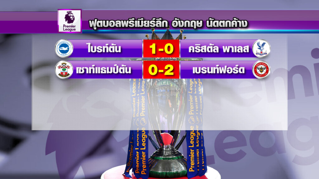 ด้านผลฟุตบอลพรีเมียร์ลีก อังกฤษ เมื่อคืนที่ผ่านมา มีเตะ 2 คู่ ไบรท์ตัน ชนะ คริสตัล พาเลซ 1-0 และ เซาธ์แฮมป์ตัน แพ้ เบรนท์ฟอร์ด 0-2 .-สำนักข่าวไทย