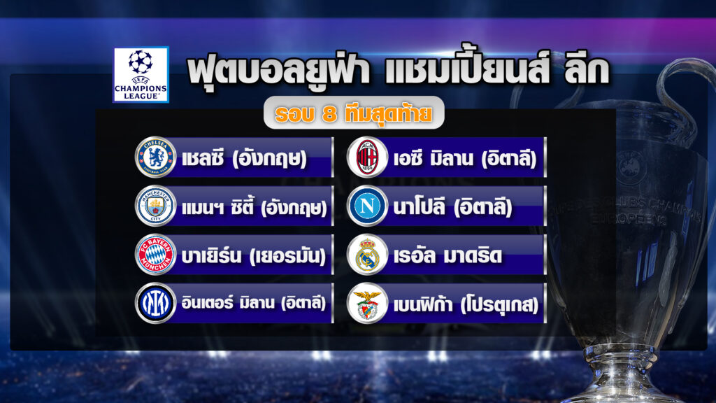สรุป 8 สโมสร ที่ผ่านเข้ารอบ 8 ทีมสุดท้าย ประกอบด้วย เชลซี และ แมนฯ ซิตี้ จากอังกฤษ, บาเยิร์น จากเยอรมนี, อินเตอร์ มิลาน, เอซี มิลาน และนาโปลี จากอิตาลี, เรอัล มาดริด จากสเปน และเบนฟิก้า จากโปรตุเกส โดยรอบนี้ทุกทีมมีโอกาสพบกันได้หมด ไม่มีทีมวาง และทีมจากประเทศเดียวกันก็สามารถพบกันได้ ส่วนการจับสลากประกบคู่รอบ 8 ทีมสุดท้าย จะมีขึ้นในวันศุกร์ที่ 17 มีนาคมนี้ เวลา 18.00 น. (ตามเวลาประเทศไทย)