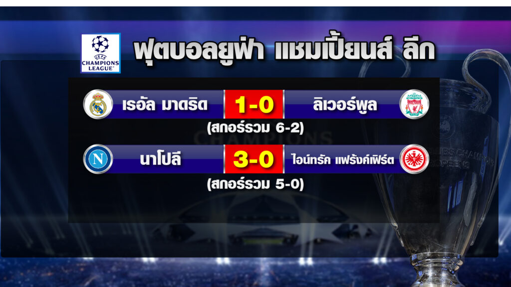 ผลอีกคู่ นาโปลี จ่าฝูง กัลโช เซเรีย อา อิตาลี เปิดบ้านถล่ม ไอน์ทรัค แฟรงค์เฟิร์ต จากเยอรมนี 3-0 ผ่านเข้ารอบ 8 ทีมสุดท้ายด้วยประตูรวม 2 นัด 5-0 ได้ประตูจาก วิคเตอร์ โอซิมเฮน คนเดียว 2 ประตู ในนาทีที่ 45+2 และ นาทีที่ 53 ส่วนอีก 1 ประตูได้จาก พิโอเตอร์ ซีลินสกี ยิงจุดโทษเข้าไปในนาทีที่ 64