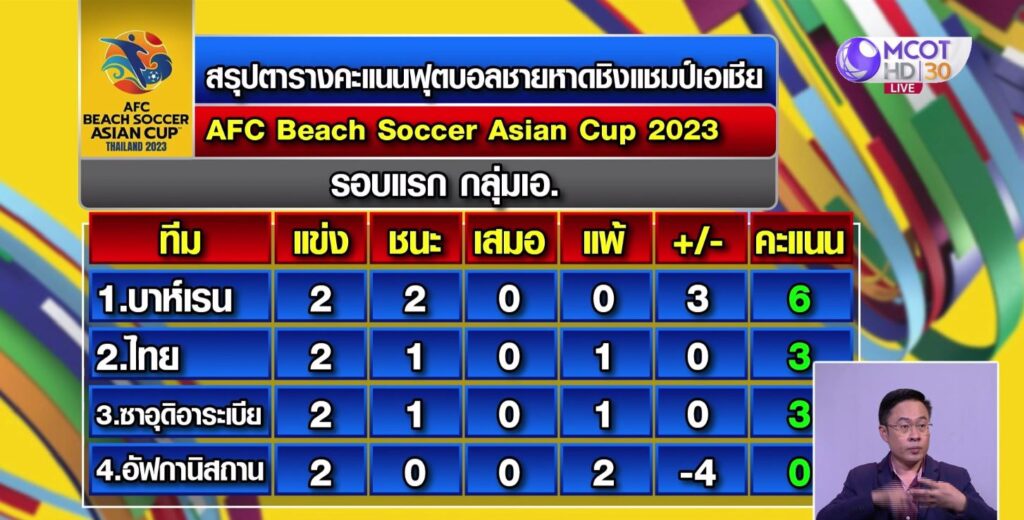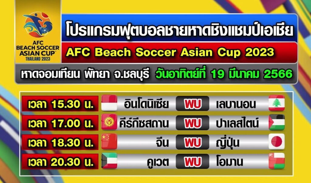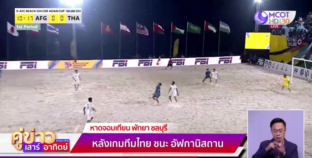 ฟุตบอลชายหาดชิงแชมป์เอเชีย รายการ AFC Beach Soccer Asian Cup 2023 ที่หาดจอมเทียน เมืองพัทยา เมื่อวานนี้ (18 มี.ค.) รอบแรก ของสายเอ ทีมชาติไทย เจ้าภาพและทีมอันดับ 90 ของโลก ชุดสีน้ำเงิน พบ ทีมชาติอัฟกานิสถาน ทีมอันดับ 91 ของโลก โดยในเกมแรกทั้ง 2 ทีมต่างแพ้มาด้วยกันทั้งคู่นัดนี้ ทั้งสองทีมต้องชนะให้ได้เพื่อลุ้นเข้ารอบสอง