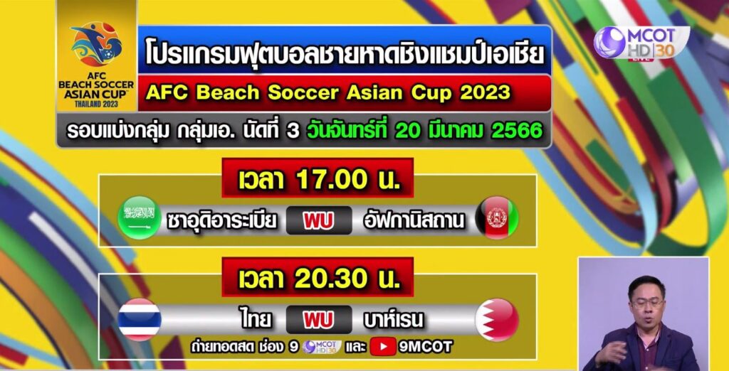ชลบุรี 19 มี.ค. – ติดตามหลังเกม ไทย ชนะ อัฟกานิสถาน 5-4 ศึกฟุตบอลชายหาดชิงแชมป์เอเชีย “คมกริช” หวังทำประตูอีกในเกมพบบาห์เรน พรุ่งนี้ (20 มี.ค.) ช่อง 9 MCOT HD หมายเลข 30 ถ่ายทอดสด เวลา 20.30 น.