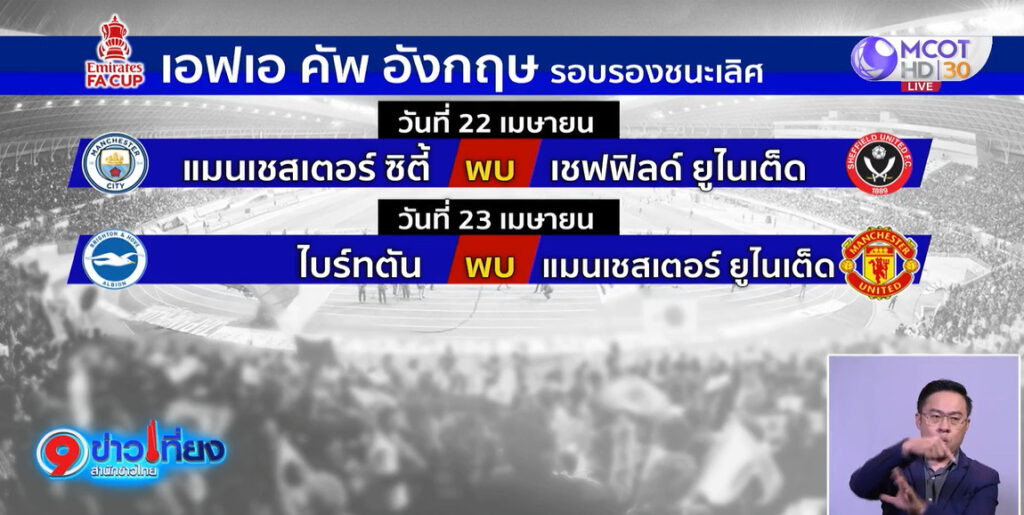 ส่วนผลการประคู่ รอบรองชนะเลิศ แมนเชสเตอร์ ซิตี้ พบ เชฟฟิลด์ ยูไนเต็ด และ ไบรท์ตัน พบ แมนเชสเตอร์ ยูไนเต็ด โดยจะเตะวันที่ 22 และ 23 เมษายนนี้ ที่สนามเวม บลีย์ กรุงลอนดอน ประเทศอังกฤษ .-สำนักข่าวไทย