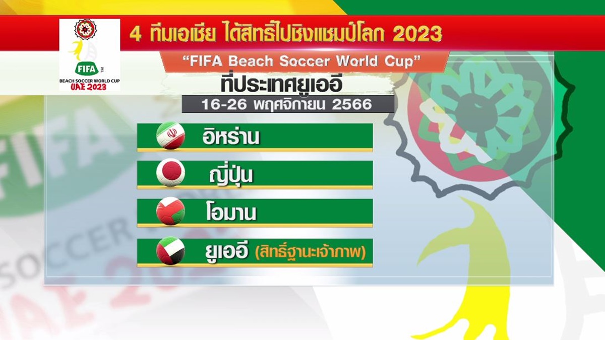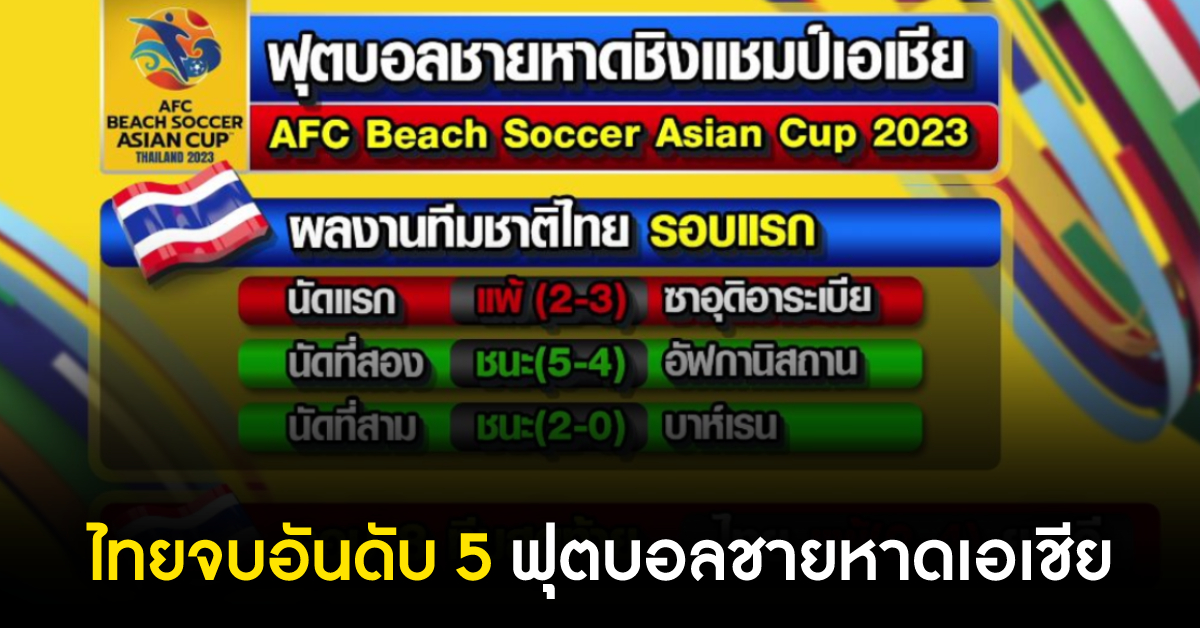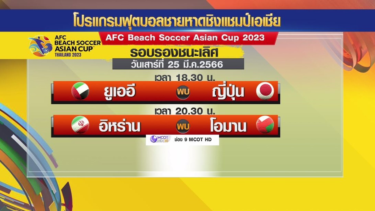 ชลบุรี 24 มี.ค. – ทีมชาติไทย จบอันดับ 5 ศึกฟุตบอลชายหาดชิงแชมป์เอเชีย 2023 หลังตกรอบ 8 ทีมสุดท้าย ส่วนรอบรองชนะเลิศ วันพรุ่งนี้ (25 มี.ค.66) ช่อง 9 MCOT HD หมายเลข 30 ยิงสดคู่ อิหร่าน พบ โอมาน