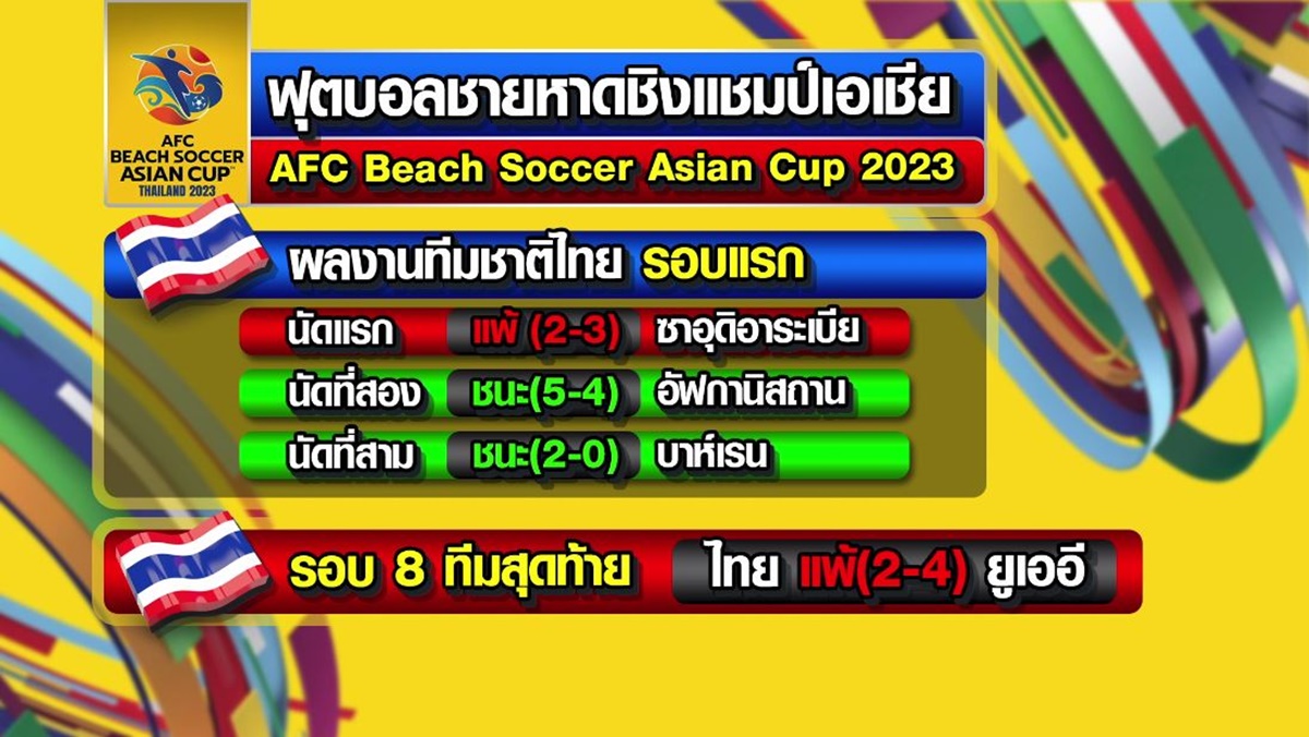 สำหรับผลงานของทีมฟุตบอลชายหาดทีมชาติไทยใน AFC Beach Soccer Asian Cup 5 ครั้งที่ผ่านมา ประกอบด้วย ปี 2013 ที่กาตาร์ จบอันดับ 13, ปี 2015 ที่กาตาร์ จบอันดับ 13, ปี 2017 ที่มาเลเซีย จบอันดับ 10, ปี 2019 ที่ไทย จบอันดับ 12 และล่าสุดปี 2023 ที่พัทยา จ.ชลบุรี จบอันดับ 5 โดยผลงานในรอบแรก นัดแรก แพ้ ซาอุดีอาระเบีย 2-3 นัดที่ 2 ชนะ อัฟกานิสถาน 5-4 และนัดที่ 3 ชนะ บาห์เรน 2-0 ก่อนแพ้ ยูเออี รองแชมป์เก่า 2-4 ในรอบ 8 ทีมสุดท้าย