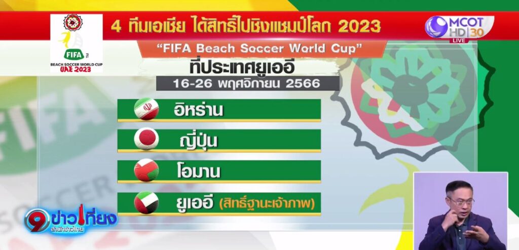 สรุปทีมที่ได้โควตาเอเชียไปแข่งขันฟุตบอลชายหาดชิงแชมป์โลก 2023 FIFA Beach Soccer World Cup รอบสุดท้ายที่ยูเออี, อิหร่าน ฐานะแชมป์, ญี่ปุ่น รองแชมป์, โอมาน อันดับ 3 และ ยูเออี ได้สิทธิ์ในฐานะเป็นเจ้าภาพ. – สำนักข่าวไทย