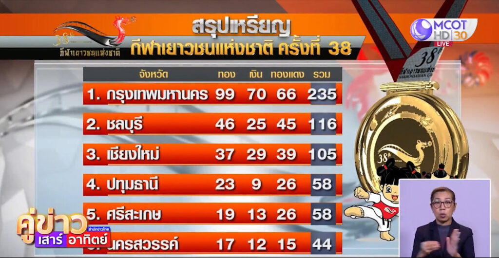ดูกระบี่กระบองกันแล้ว ไปดูวูซู ยุทธลีลากันบ้าง ยุธลีลาฉางฉวน บุคลลชาย รอบชิงชนะเลิศ ศิริมงคล สีดา จอมยุธรหนุ่มจากชลบุรี โชว์ลีลา ประทับใจกรรมการ ทำได้ 8.92 คะแนน คว้าเหรียญทองไปครอง กีฬาซอฟท์เทนนิส รอบชิงชนะเลิศ ที่สนามกีฬาจังหวัดนครสวรรค์ บัณฑิตา พึ่งประภา จากจังหวัดน่าน หวดเอาชนะ ณัชชา กล่อมกมล จากสุโขทัย 4-2 เซต คว้าเหรียญทองไปครอง ท่ามกลางสภาพอากาศร้อนจัดที่จังหวัดนครสวรรค์ ปิดท้ายที่มวยไทยสมัครเล่น ที่โรงเรียนกีฬาจังหวัดนครสวรรค์ รุ่นน้ำหนักไม่เกิน 54 กิโลกรัมหญิง รอบชิงชนะเลิศ มิญชญา สิมวงศ์ จากบุรีรัมย์ มุมแดง เอาชนะทีเคโอ ภัสธิดา มีพริ้ง จากสุราษฎร์ธานี ในยกที่ 2 คว้าเหรียญทองไปครอง