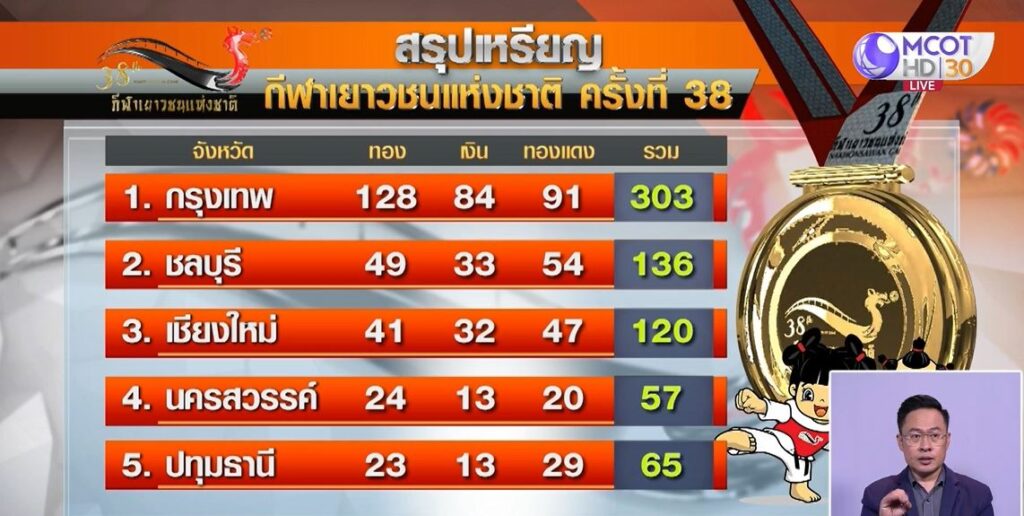 สรุปเหรียญทอง ล่าสุด กทม. ยังครองอันดับ 1 มี 128 เหรียญทอง 84 เหรียญเงิน 91 เหรียญทองแดง ส่วนชลบุรีอยู่อันดับ 2 มี 49 เหรียญทอง แลเชียงใหม่ อันดับ 3 มี 41 เหรียญทอง ขณะที่เจ้าภาพ นครสวรรค์ มี 24 เหรียญทอง อยู่อันดับ 4 .-สำนักข่าวไทย