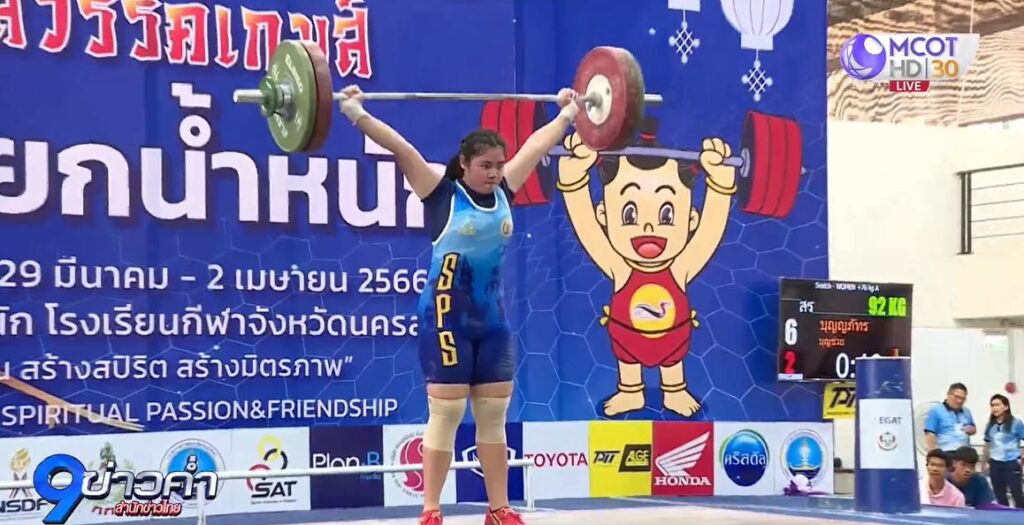 ยกน้ำหนัก วันสุดท้าย ชิง 9 เหรียญทอง ที่โรงเรียนกีฬาจังหวัดนครสวรรค์ รุ่นน้ำหนักมากกว่า 76 กิโลกรัมหญิง รอบชิงชนะเลิศ บุญญภัทร บุญช่วย จอมพลังสาวเยาวชนทีมชาติไทย จากสุรินทร์ กวาดคนเดียว 3 เหรียญทอง ท่าสแนทช์ยกได้ 92 กิโลกรัม คลีนแอนด์เจิร์ก 115 กิโลกรัม และน้ำหนักรวม 207 กิโลกรัม