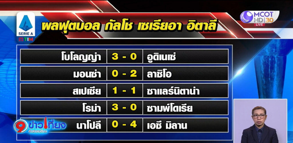 ผลคู่อื่นๆ โบโลญญ่า ชนะ อูดิเนเซ่ 3-0 , มอนซ่า แพ้ ลาซิโอ 0-2, สเปเซีย เสมอ ซาแลร์นิตาน่า 1-1, โรม่า ชนะ ซามพ์โดเรีย 3-0.-สำนักข่าวไทย