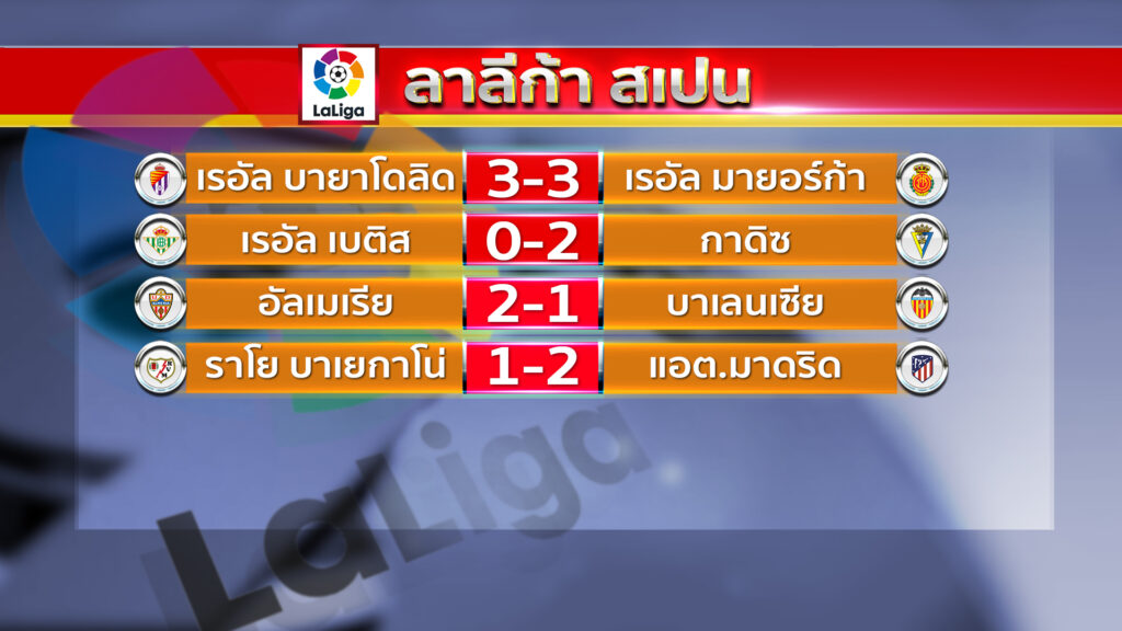 ขณะที่ ผลฟุตบอลลาลีกา สเปน เรอัล บายาโดลิด เสมอ เรอัล มายอร์กา 3-3, เรอัล เบติส แพ้ กาดิซ 0-2, อัลเมเรีย ชนะ บาเลนเซีย 2-1 และ ราโย บาเยกาโน แพ้ แอต.มาดริด 1-2 .-สำนักข่าวไทย