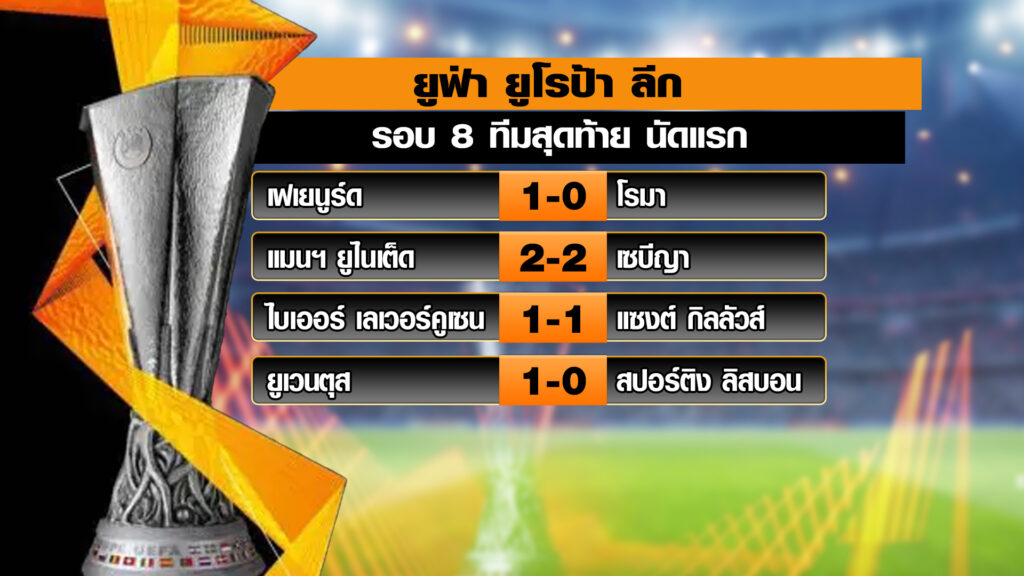 ผลฟุตบอลยูฟ่า ยูโรป้า ลีก รอบ 8 ทีมสุดท้าย นัดแรก เมื่อคืนที่ผ่านมา “ปีศาจแดง” แมนเชสเตอร์ ยูไนเต็ด แห่งพรีเมียร์ลีก อังกฤษ เปิดสนามโอลด์ แทรฟฟอร์ด เสมอกับ เซบียา จากศึกลา ลีกา สเปน 2-2 โดยเกมในครึ่งแรก แมนฯ ยูไนเต็ด ขึ้นนำก่อน 2-0 จากการเหมายิงคนเดียวของ มาร์เซล ซาบิตเซอร์ ในนาทีที่ 14 และ นาทีที่ 21 แต่ครึ่งหลังเซบียา มาทำ 2 ประรวดในช่วงท้ายเกม โดยนาทีที่ 84 ไล่มาเป็น 1-2 จากการยิงของ เฆซุส นาบาส บอลไปแฉลบ ไทเรลล์ มาลาเซีย ทำเข้าประตูตัวเอง ก่อนที่ ยุสเซฟ เอน-เนซีรี จะโหม่งแฉลบ แฮร์รี แมกไกวร์ เข้าประตูตัวเองไปอีกในนาทีที่ 90+3 เกมนัดที่ 2 จะไปเตะที่เอสตาดิโอ รามอน ซานเชซ ปิซฆวน บ้านของเซบียา ในวันพฤหัสบดีที่ 20 เม.ย. นี้