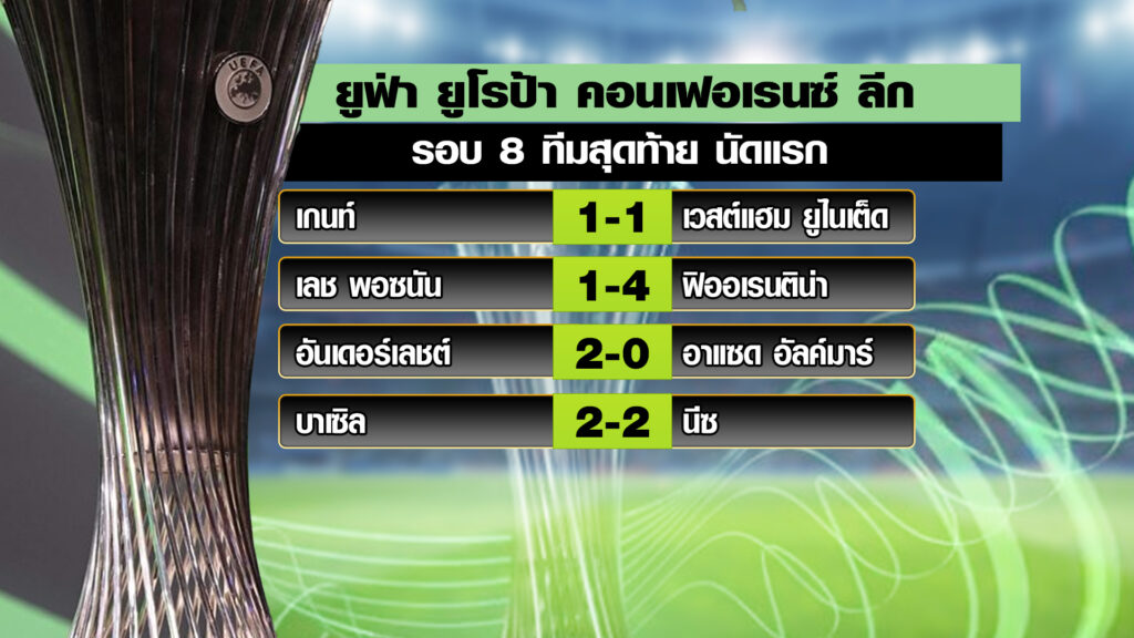 ด้านผลฟุตบอล ยูฟ่า ยูโรป้า คอนเฟอเรนซ์ ลีก รอบ 8 ทีมสุดท้าย นัดแรก เกนท์ เสมอ เวสต์แฮม ยูไนเต็ด 1-1, เลช พอซนัน แพ้ ฟิออเรนตินา 1-4, อันเดอร์เลชต์ ชนะ อาแซด อัลค์มาร์ 2-0 และ บาเซิล เสมอ นีซ 2-2 .-สำนักข่าวไทย
