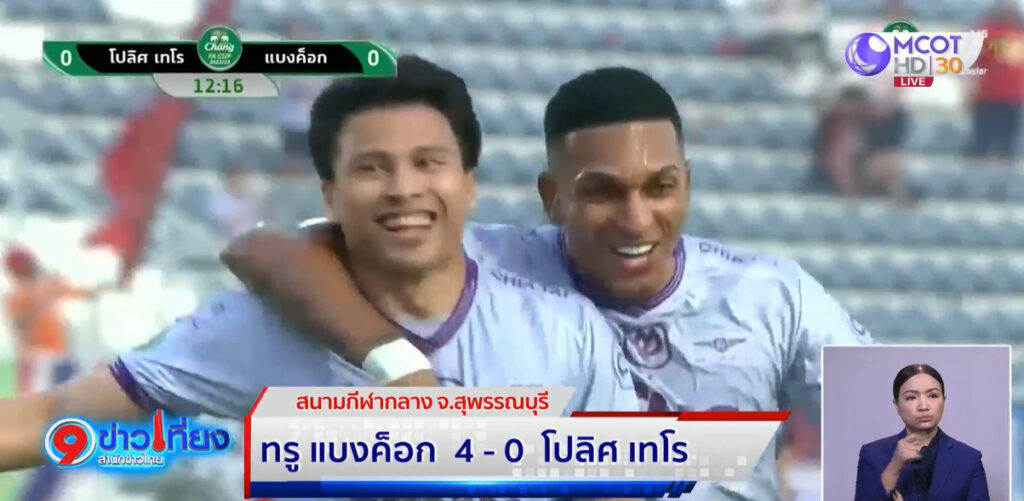 อีกคู่ ในรอบรองชนะเลิศ ที่สนามกีฬากลางจังหวัดสุพรรณบุรี ทรู แบงค็อก ยูไนเต็ด พบกับ โปลิศ เทโร เอฟซี เกมนี้แบงค็อก นำเร็วตั้งแต่นาทีที่ 13 จากการโหม่งของ ฐิติพันธ์ พ่วงจันทร์ ครึ่งหลัง นาทีที่ 73 วานเดอร์ เดอร์ หลุยส์ เปิดบอลให้ วิลเลน โมต้า โขกเข้าไปให้ ทรู แบงค็อก ยูไนเต็ด นำ 2-0 จากนั้นท้ายเกมแบงค็อกมาได้อีก 2 ประตูจาก มาห์มูด เอด และ วิลเลน โมต้า จบเกม ทรู แบงค็อก ยูไนเต็ด ถล่ม โปลิศ เทโร เอฟซี 4-0 ผ่านเข้าสู่รอบชิงชนะเลิศไปพบกับ บุรีรัมย์ โดยจะแข่งในวันที่ 28 พฤษภาคมนี้.-สำนักข่าวไทย