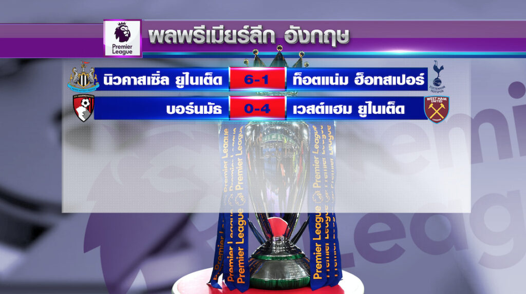 ส่วนผล พรีเมียร์ลีก อังกฤษ มีเตะ 2 คู่ บอร์นมัธ แพ้ เวสต์แฮม ยูไนเต็ด 0-4 และ นิวคาสเซิล ยูไนเต็ด ถล่มเอาชนะ “ไก่เดือยทอง” ท็อตแนม ฮอตสเปอร์ส 6-1 “สาลิกาดง” มีเพิ่มเป็น 59 คะแนน จาก 31 นัด แซง แมนฯ ยูไนเต็ด ขึ้นไปรั้งอันดับ 3 จากการมีแต้มเท่ากัน แต่ผลต่างประตูได้เสียดีกว่า และลงเตะมากกว่า 1 นัด .-สำนักข่าวไทย