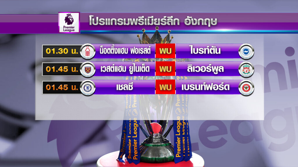 ส่วนโปรแกรมคู่อื่นเวลา 01.30 นาฬิกา นอตติงแฮม ฟอเรสต์ พบ ไบรท์ตัน และเวลา 01.45 นาฬิกา เวสต์แฮม ยูไนเต็ด พบ ลิเวอร์พูล และ เชลซี พบ เบรนท์ฟอร์ด .-สำนักข่าวไทย