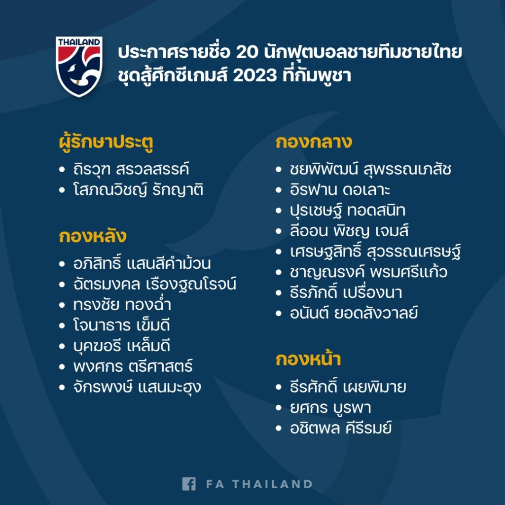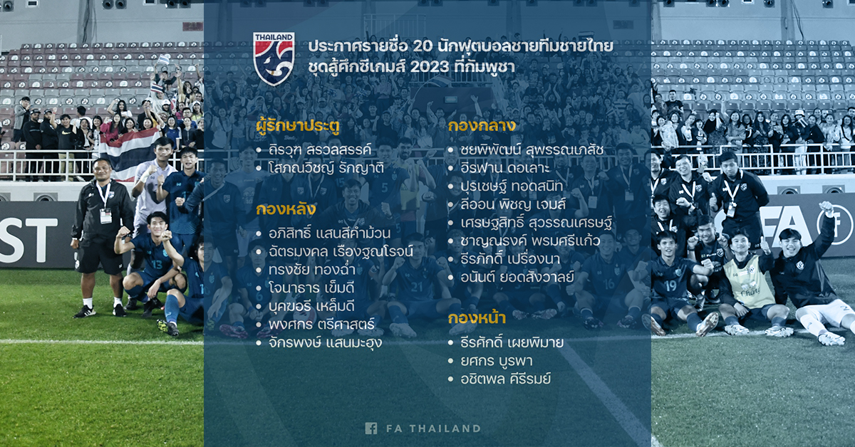 กทม. 26 เม.ย.- สมาคมฟุตบอลฯ ประกาศรายชื่อ 20 นักฟุตบอลชายทีมชาติไทย รุ่นอายุไม่เกิน 22 ปี ชุดสู้ศึกซีเกมส์ 2023 ที่กัมพูชา