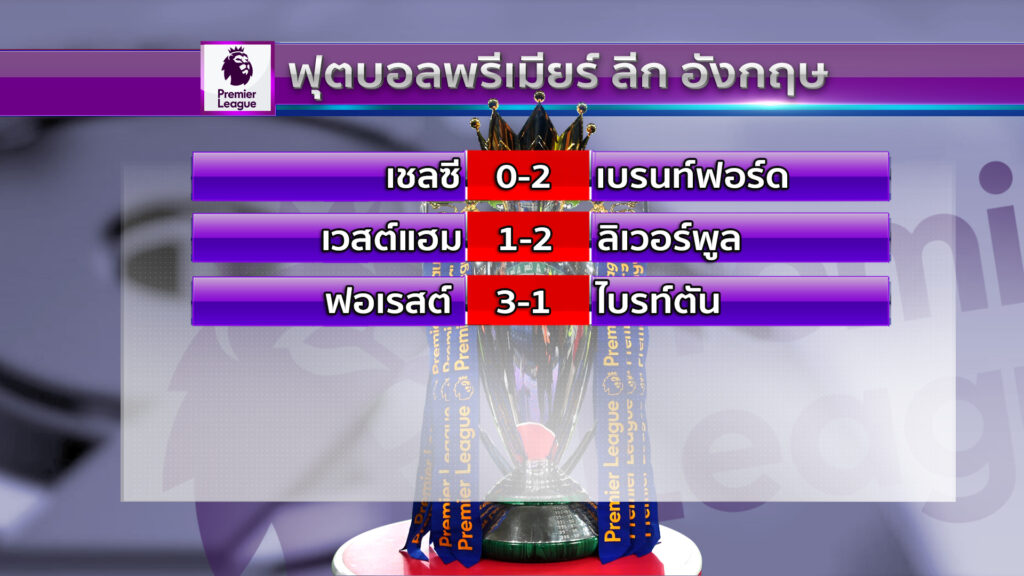 ผลคู่อื่นๆ นอตทิงแฮมฟอเรสต์ เปิดบ้านเอาชนะ ไบรท์ตัน 3-1, เวสต์แฮม ยูไนเต็ด แพ้ ลิเวอร์พูล 1-2, เชลซี เปิดบ้านแพ้ เบรนท์ฟอร์ด 0-2