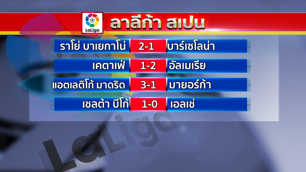 ส่วนผล ลาลีกา สเปน เกตาเฟ เปิดบ้านแพ้ อัลเมเรีย 1-2, แอตเลติโก มาดริด ชนะ มายอร์กา 3-1, เซลตา บีโก เปิดบ้านอาชนะ เอลเช 1 – 0, บาร์เซโลนา บุกไปแพ้ ราโย บาเยกาโน 1 – 2