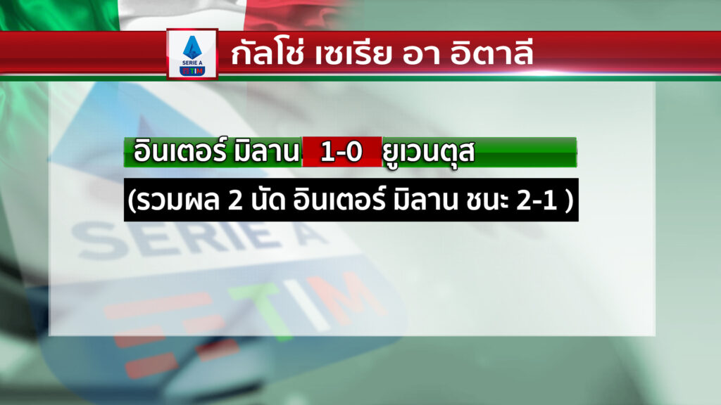 ผลฟุตบอลถ้วย โคปปา อิตาเลีย รอบรองชนะเลิศ นัดสอง อินเตอร์ มิลาน เอาชนะ ยูเวนตุส 1-0 รวมผล 2 นัดอินเตอร์ชนะ 2-1 ผ่านเข้าสู่รอบชิงชนะเลิศไปรอพบผู้ชนะระหว่าง ฟิออเรนตินา หรือ เครโมเนเซ .-สำนักข่าวไทย