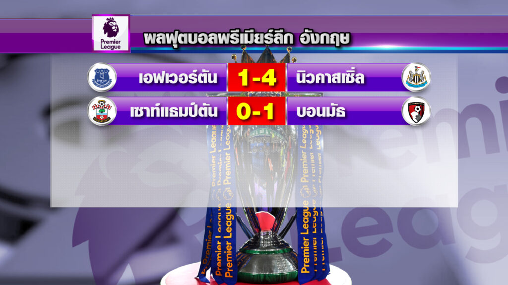 ส่วนผลคู่อื่นๆ เอฟเวอร์ตัน เปิดบ้านแพ้ นิวคาสเซิล 1-4 และ เซาแธมป์ตัน เปิดบ้านแพ้ บอนมัธ 0-1