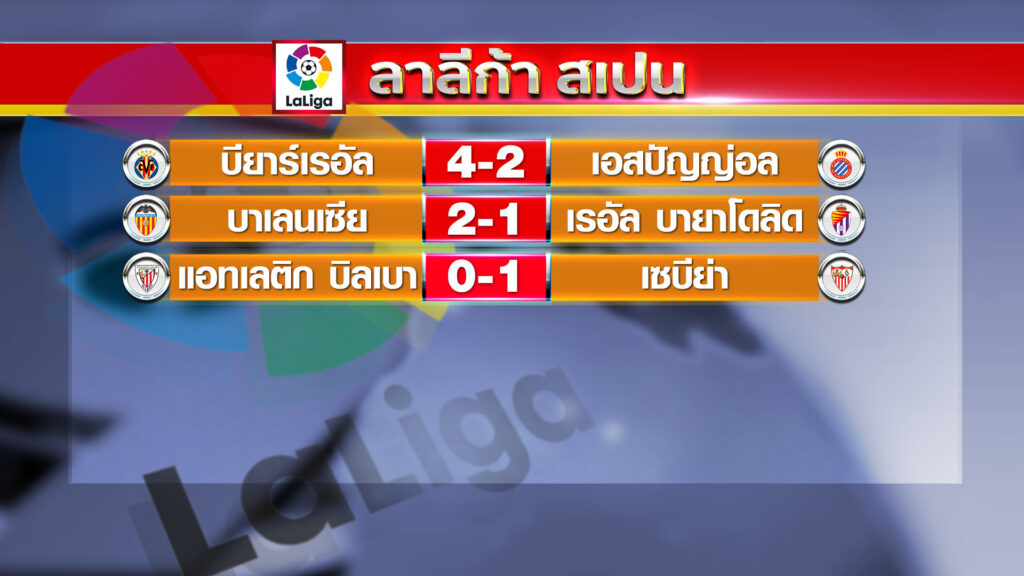 ด้านผลฟุตบอลลาลีกา สเปน บียาร์ เรอัล เปิดบ้านชนะ เอสปัญญอล 4-2 บาเลนเซีย เปิดบ้านชนะ เรอัล บายาโดลิด 2-1 และ แอตเลติก บิลเบา เปิดบ้านแพ้ เซบีย่า 0-1