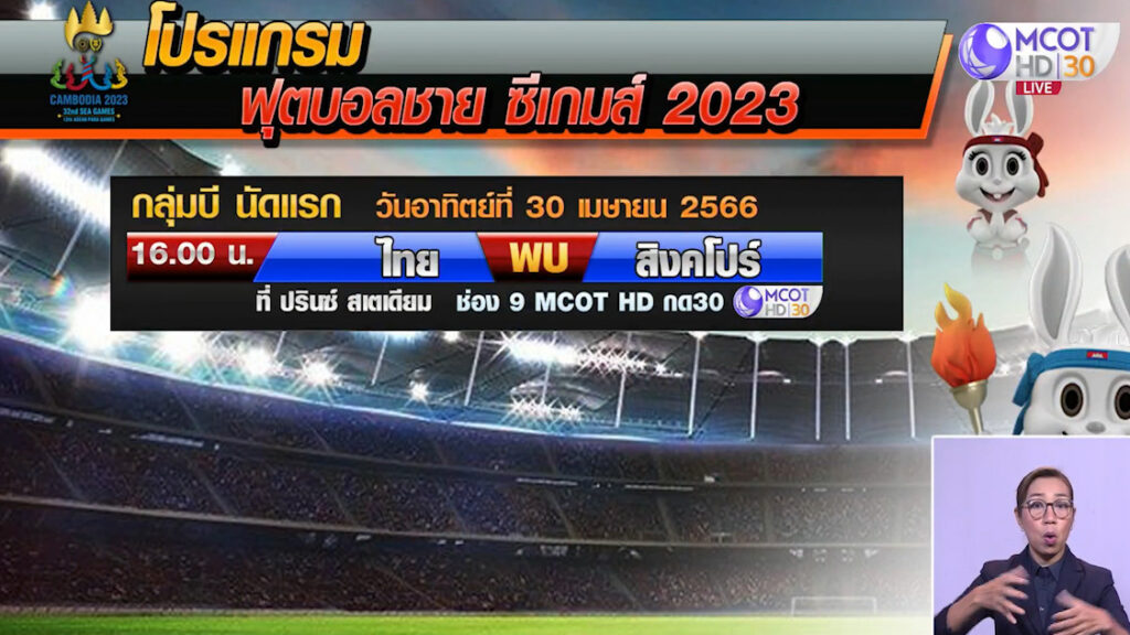 สำหรับเกมระหว่างทีมชาติไทย พบ สิงคโปร์ ในฟุตบอลชายซีเกมส์ รอบแบ่งกลุ่ม กลุ่มบี นัดแรก ที่ปรินซ์ สเตเดียมวันพรุ่งนี้ ช่อง 9 MCOT HD กด 30 ถ่ายทอดสดให้แฟนบอลได้ชมตั้งแต่เวลา 16.00 น.เป็นต้นไป.-สำนักข่าวไทย