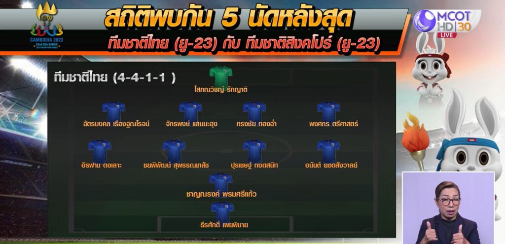 ฟุตบอลชายซีเกมส์ ครั้งที่ 32 ที่ประเทศกัมพูชา รอบแรก นัดแรก กลุ่มบี ที่สนามปริ๊นซ์ สเตเดียม เวลา 16.00 น. ทีมชาติไทย พบ สิงคโปร์ ถ่ายทอดสดทาง ช่อง 9 MCOT HD กด 30 และ ช่อง TSports 7 ทีมชาติไทย ใส่ชุดสีน้ำเงินลงสนามภายใต้การคุมทัพของ “โค้ชหระ” อิสสระ ศรีทะโร เกมนี้จะไม่มี โจนาธาร เข็มดี กองหลังจากราชบุรี เอฟซี และเศรษฐสิทธิ์ สุวรรณเศรษฐ์ มิดฟิลด์จากลีโอ เชียงราย ยูไนเต็ด ที่ติดภารกิจกับสโมสร จะเดินทางตามมาสมทบภายหลัง ส่วนตัวหลักคนอื่นพร้อมลงสนาม ทั้ง อิรฟาน ดอเลาะ, ธีรศักดิ์ เผยพิมาย , ชาญณรงค์ พรมศรีแก้ว และ ทรงชัย ทองฉ่ำ