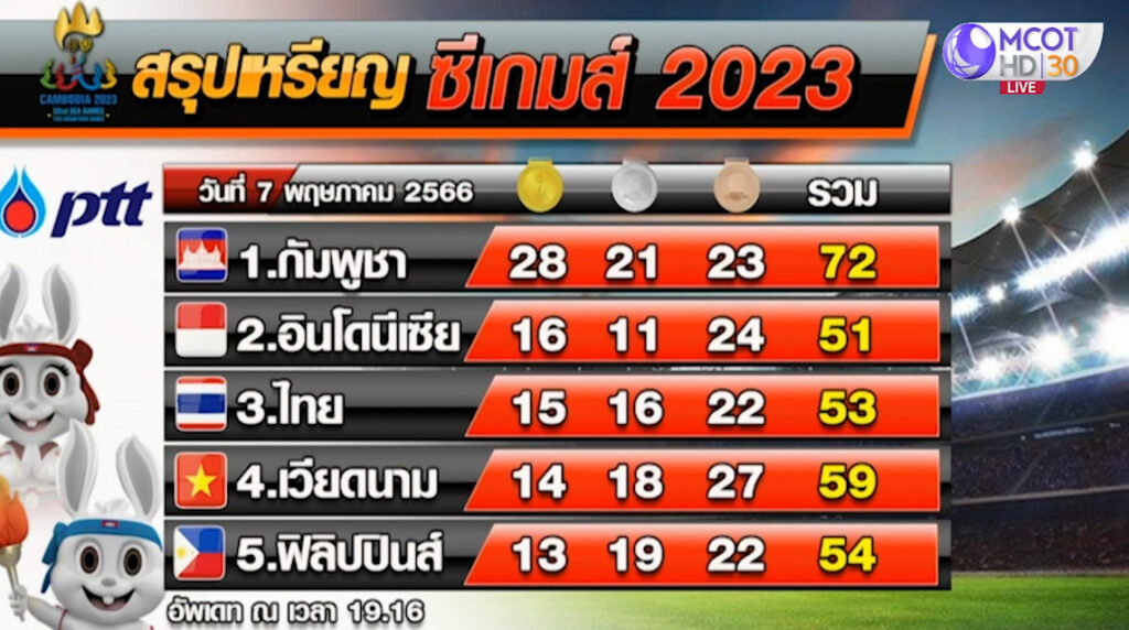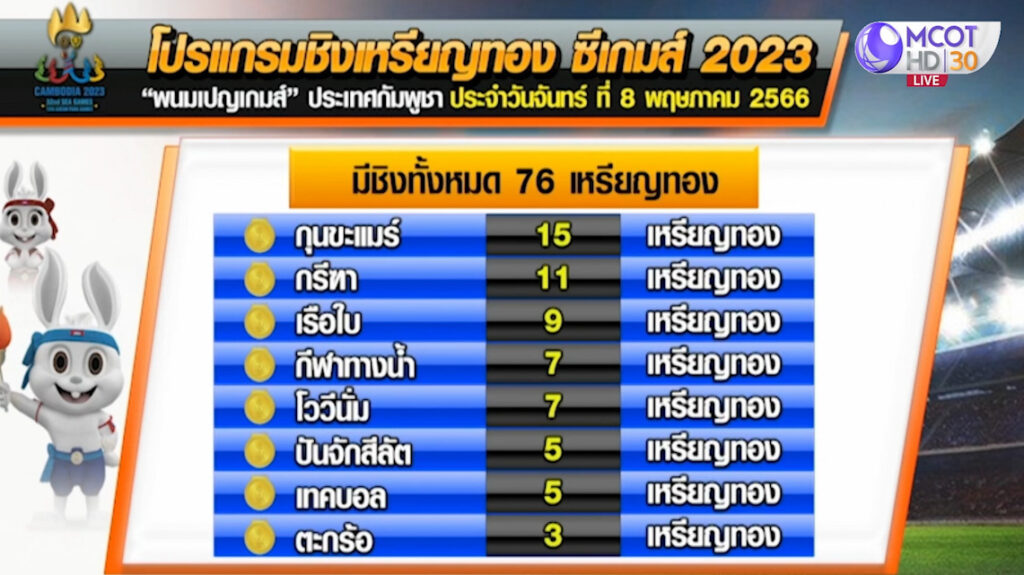สรุปเหรียญทอง อันดับ 1 กัมพูชา เจ้าภาพ คว้า 28 เหรียญทอง 21 เหรียญเงิน 23 เหรียญทองแดง ส่วนไทยอยู่อันดับ 3 คว้า 15 เหรียญทอง 16 เหรียญเงิน 22 เหรียญทองแดง