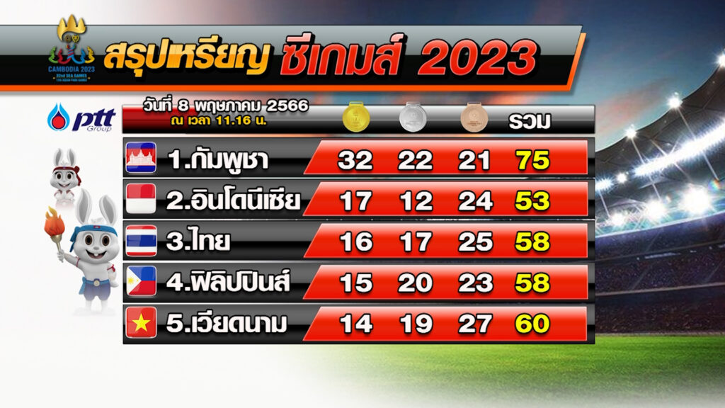 สรุปเหรียญทองล่าสุด อันดับ 1 กัมพูชา 32 เหรียญทอง อันดับ 2 อินโดนีเซีย 17 เหรียญทอง และอันดับ 3 ทีมชาติไทย 16 เหรียญทอง 17 เหรียญเงิน 25 เหรียญทองแดง .-สำนักข่าวไทย